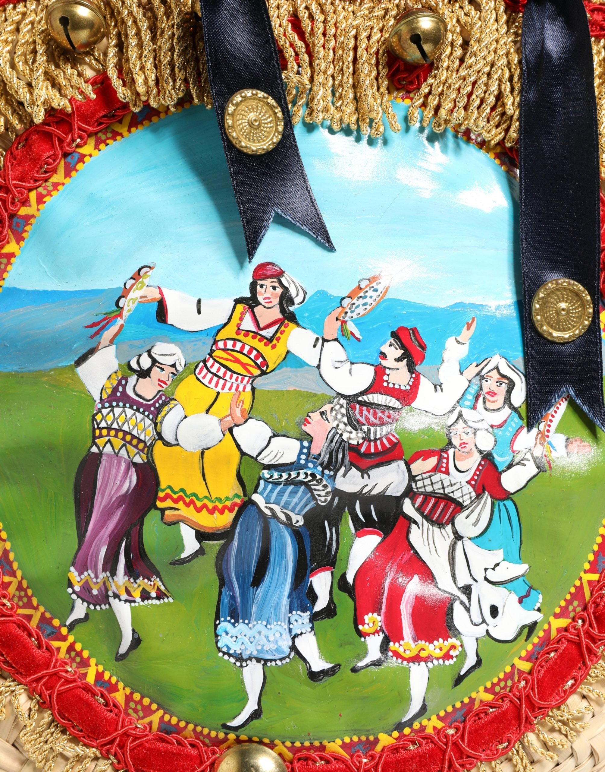 Design: Medalhão central com ilustração folclórica siciliana; orla decorada com passamanaria dourada e guizos metálicos